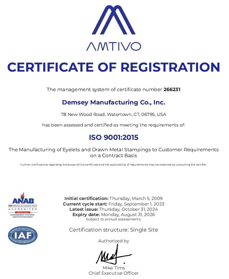 At Demsey Manufacturing, we are a global manufacturer of precision quality stamped, formed, and deep drawn parts. With our strong manufacturing background, we push the boundaries of metal forming to produce close tolerance parts for critical applications where failure is not an option. We stay on the forefront of new technology and are continually optimizing our processes to advance our stamping and metal forming capabilities.
